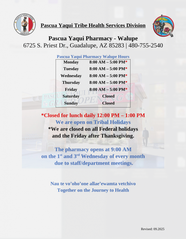 In 2008, through a healthcare contract with El Rio Santa Cruz Neighborhood Health Center, El Rio Pascua Pharmacy opened its doors as a on-site pharmacy in the Hiak Hetavi Kari building in new Pascua reservation. During this time, the pharmacy was staffed with two pharmacists and five pharmacy technicians. The pharmacy was remodeled in 2015, and in 2021, relocated to the Pascua Yaqui Tribe Health and Social Services Family Center to a newly built space. In 2023, the Pascua Yaqui Tribe Health Services Division assumed El Rio Pascua Pharmacy as a Tribal pharmacy under the new name, Pascua Yaqui Pharmacy. Today, we have four pharmacists, six pharmacy technicians, and a pharmacy technician specialist. We look forward in continuing to provide medication services and meeting our community needs as your preferred pharmacy.